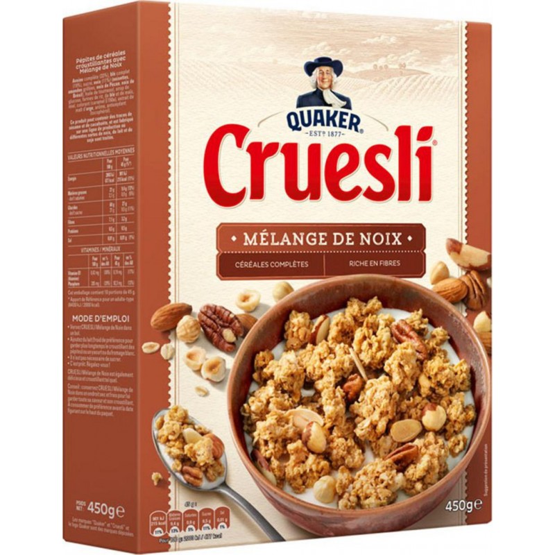 Chaque matin, réveillez vos papilles avec Quaker Cruesli: des pépites croquantes de flocons d'avoine et blé complets délicatement dorées au four, de généreux morceaux de noisettes, amandes grillées, noix du Brésil et noix de Pécan, pour un petit-déjeuner savoureux pour toute la famille. Lot économique de 4 paquets. Avoine complète (33%), blé complet (19%), sucre, noix 11% (noisettes, noix du Brésil, amandes grillées, noix de Pécan), huile de tournesol, sirop de glucose, farines de riz, de blé et de maïs, miel, colorant (caramel E150a), extrait de malt d'orge, arôme, antioxydant (tocophérol). Produit unitaire EAN 3168930010265, lot de 4 EAN 3701018067708.