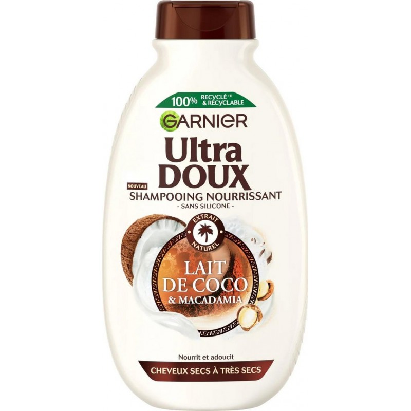 Shampooing nourrissant Garnier Ultra Doux au Lait de Coco et Macadamia pour nourrir, adoucir et assouplir les cheveux. Résultat: intensément nourris, vos cheveux sont plus souples, brillants, doux au toucher et rayonnent de beauté. 1161774 H - AQUA / WATER - SODIUM LAURETH SULFATE - COCO-BETAINE - GLYCERIN - GLYCOL DISTEARATE - SODIUM CHLORIDE - PARFUM / FRAGRANCE - MACADAMIA INTEGRIFOLIA SEED OIL - COCOS NUCIFERA OIL / COCONUT OIL - CARBOMER - PPG-5-CETETH-20 - SODIUM HYDROXIDE - CITRIC ACID - POLYQUATERNIUM-10 - SODIUM BENZOATE - LINALOOL - LIMONENE - BENZYL ALCOHOL - BENZYL SALICYLATE (F.I.L. Z70019986/1). Les listes d' entrant dans la composition des produits de notre marque sont régulièrement mises à jour. Avant d'utiliser un produit de notre marque, vous êtes invités à lire la liste d' figurant sur son emballage afin de vous assurer que les sont adaptés à votre utilisation personnelle. Produit unitaire EAN 3600542525626.