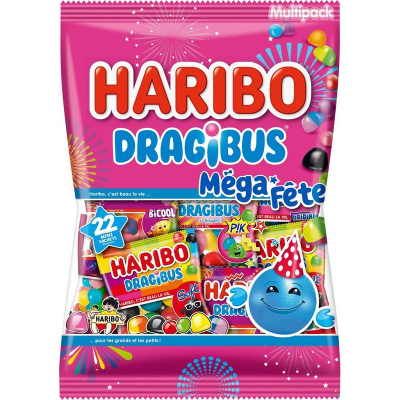 Un mélange spécial Haribo des traditionnels Dragibus et des Dragibus Soft. Goûtez le moelleux de ces dragées parfumées de toutes tailles! sucre, sirop de glucose, amidon, acidifiant E330, correcteur d'acidité: E331, gélatine, fécule, arômes, colorants: E104, E110, E122, E124, E129, E131, E132, E133, E151, E153, huile végétale, agents d'enrobage: cire de carnauba. Produit unitaire EAN 3103220063453.